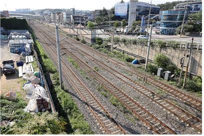 ▶오류철도고가차도 아래 철길(개통 당시 오류동역이 있던 곳)
