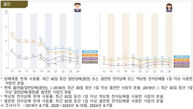 2024년 현재 흡연율(일반담배 기준)은 남학생 4.8%, 여학생 2.4%로, 2005년(남 14.3%, 여 8.9%)과 비교해 약 70% 감소했다. 현재 음주율도 남학생 11.8%, 여학생 7.5%로, 2005년(남 27.0%, 여 26.9%)보다 크게 줄었다.