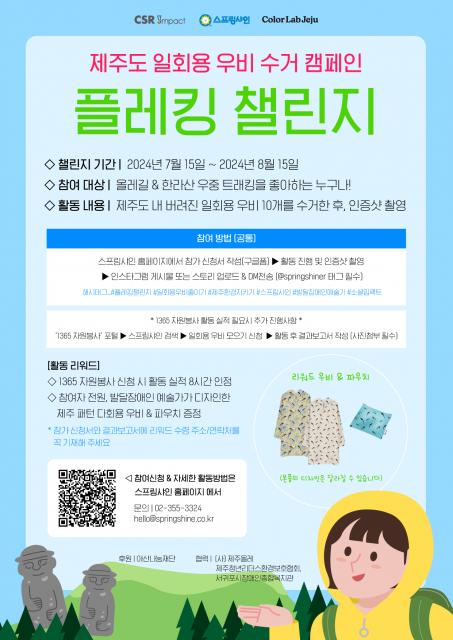 또한 플레킹 챌린지 참여자에게는 제주패턴 다회용 우비와 파우치를 증정하며, 1365자원봉사 포털에서 별도로 참여 신청을 할 경우 총 8시간의 자원봉사 시간을 인정한다. 캠페인은 오는 8월 15일까지 약 한 달간 진행되며, 스프링샤인 온라인 홈페이지에서 신청 접수를 받는다.