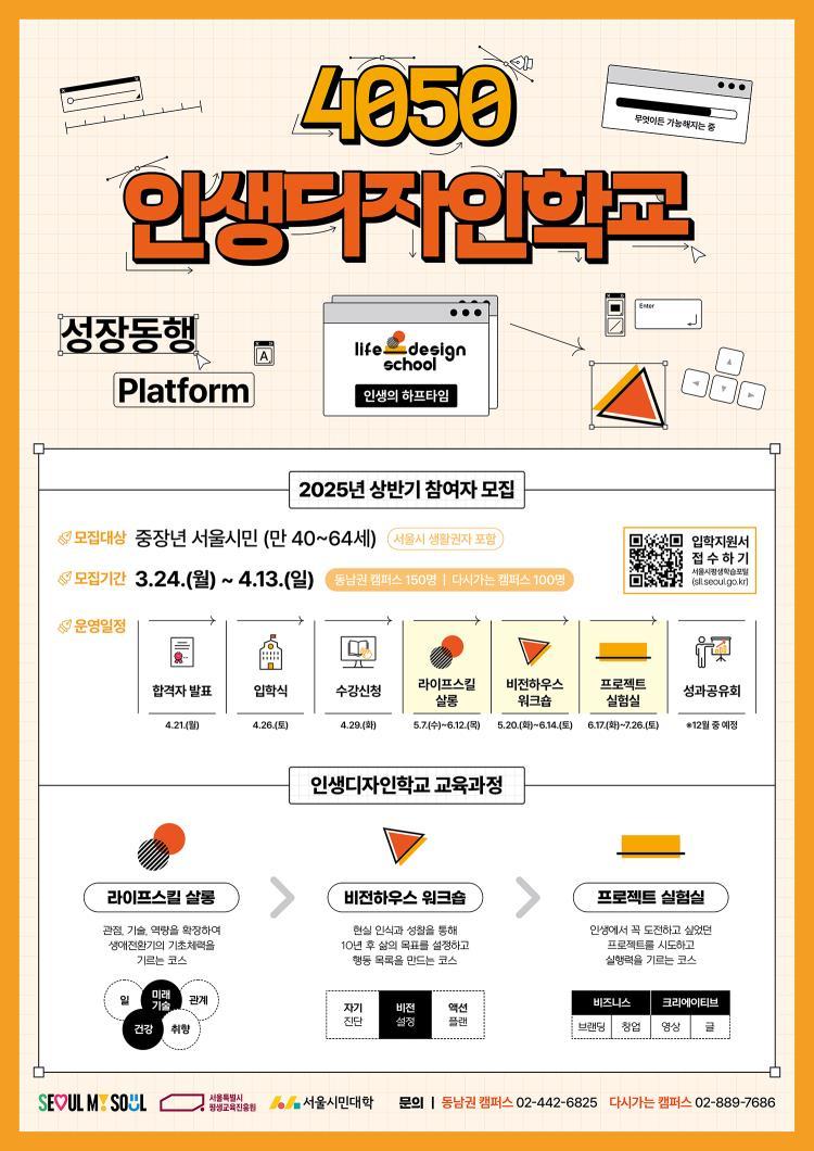 서울시평생교육진흥원(원장 한용진)이 운영하는 서울시민대학이 중장년층의 새로운 인생 설계를 지원하는 ‘인생디자인학교’ 참가자를 모집한다. 모집 기간은 3월 24일(월)부터 4월 13일(일)까지로, 만 40~64세 중장년층이 대상이다.