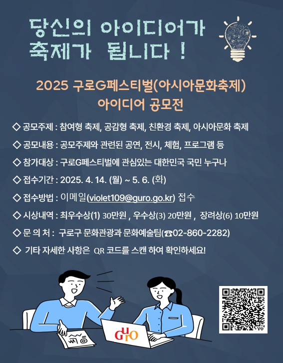 구로구(구청장 장인홍)는 구로구 대표 축제인 ‘2025년 구로 G페스티벌(아시아문화축제)’의 아이디어를 공모한다고 밝혔다.