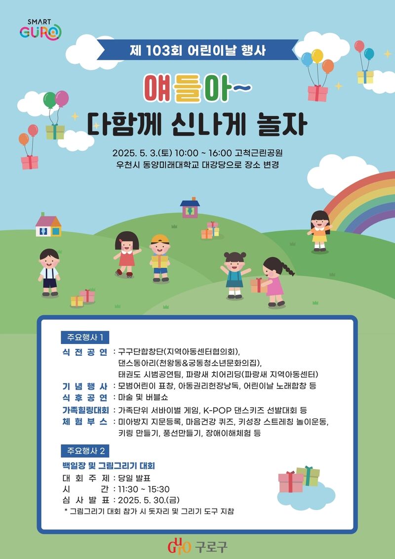 구로구(구청장 장인홍)는 5월 3일(토) 고척근린공원에서 제103회 어린이날 종합행사를 개최한다.