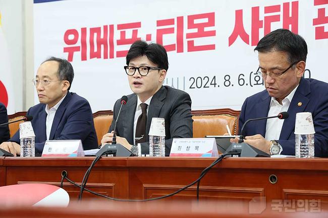 6일 오전 서울 여의도 국회 회의실에서 한동훈 당대표를 비롯한 지도부와 최상목 부총리 겸 기획재정부 장관을 비롯한 정부측 관계자들이 참석한 가운데 당 · 정협의회를 갖고 위메프와 티몬 사태에 대한 추가 대응방안 및 제도개선 방향을 논의하고 있다.