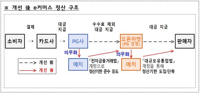 먼저, 「대규모유통업법」, 「전자금융거래법」을 개정하여 e커머스업체·PG사에 대한 정산기한을 대규모유통업자(현행 40~60일)보다 단축하여 도입하는 한편, 판매대금 별도관리 의무를 신설한다. 또한 PG사의 등록요건 등을 강화하고, 경영지도기준 미충족 시 제재 근거를 마련한다.