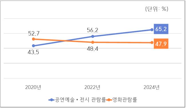 특히 문화예술 소비 형태는 공연·전시 중심으로 변화하고 있다. 공연 및 예술 전시 관람 비율은 65.2%로 영화 관람률(47.9%)을 크게 앞질렀다. OTT 서비스 확대에 따른 영화관람 감소와 함께 공연·전시의 오프라인 특성, 팬데믹 이후 시민들의 예술 욕구 증가가 복합적으로 작용한 것으로 분석된다.