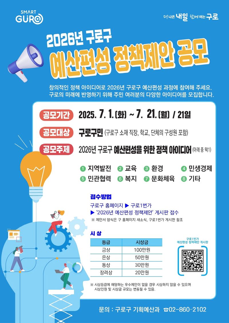 구로구(구청장 장인홍)가 7월 1일부터 21일까지 ‘2026년 예산편성 정책제안 공모’를 시행한다.