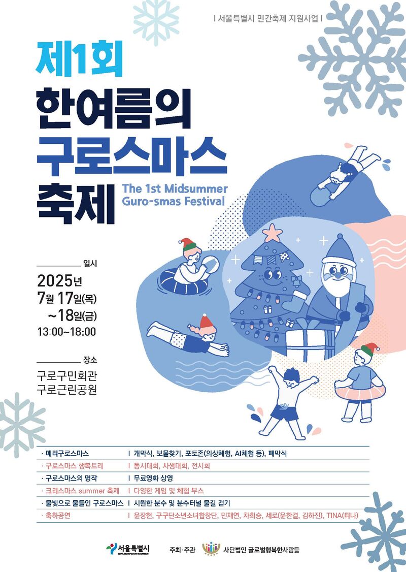 ‘제1회 한여름의 구로스마스 축제’가 오는 7월 17일과 18일 2일간 구로구민회관과 구로근린공원에서 개최된다. 이 축제는 서울시 민간축제 지원 공모사업에 사단법인글로벌행복한사람들(이사장 최형묵, 대표이사 안강현)의 신청이 선정되어 개최하게 되었다.