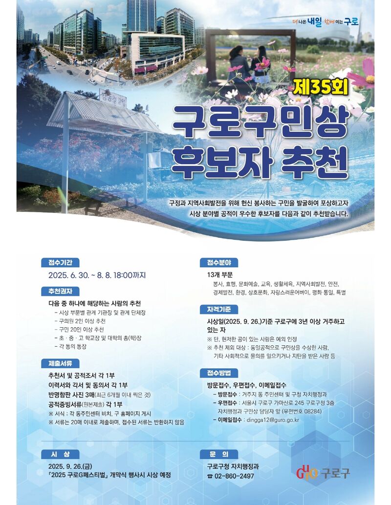 구는 8월 중 공적심사위원회 심의를 거쳐 최종 수상자를 선정하고 9월 26일 ‘2025 구로G페스티벌’ 개막식 행사에서 시상할 예정이다.