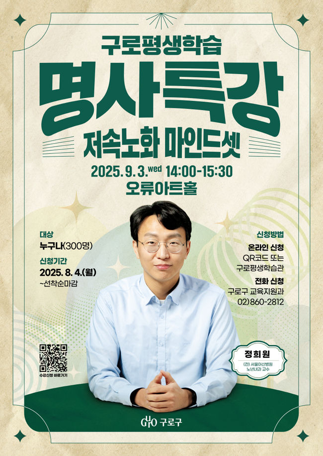 구로구(구청장 장인홍)가 9월 3일 오후 2시 오류아트홀에서 정희원 박사를 초청해 ‘저속노화 마인드셋’을 주제로 한 명사 특강을 연다고 밝혔다.