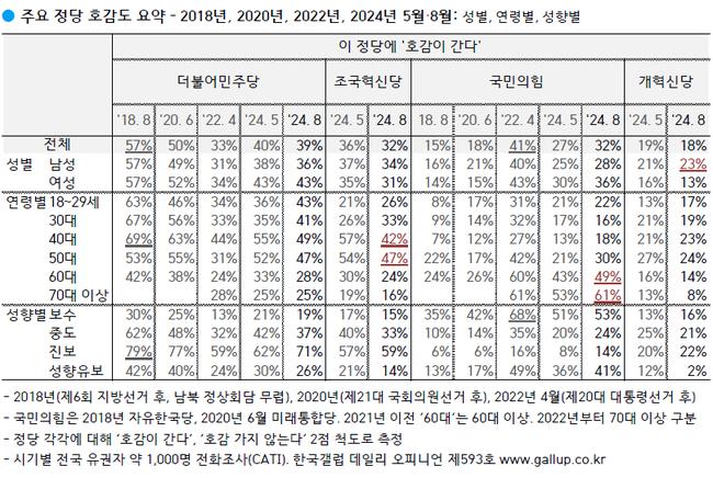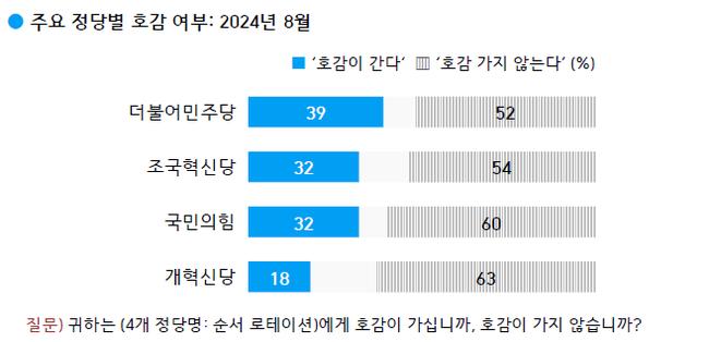 2024년 8월 20~22일 전국 만 18세 이상 유권자 1,000명에게 4개 정당별 호감 여부를 물었다(순서 로테이션). 그 결과 더불어민주당에는 39%가 `호감이 간다`(이하 `호감도`), 52%가 `호감 가지 않는다`(이하 `비호감도`)고 답했고,