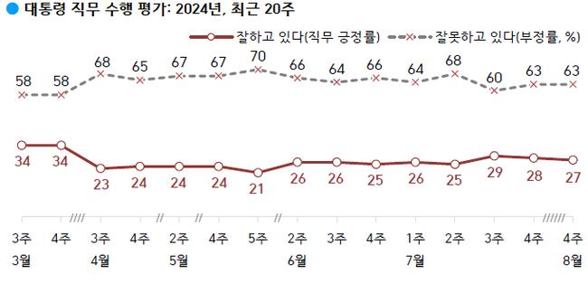 한국갤럽이 2024년 8월 넷째 주(20~22일) 전국 만 18세 이상 유권자 1,000명에게 윤석열 대통령이 현재 대통령으로서의 직무를 잘 수행하고 있다고 보는지 잘못 수행하고 있다고 보는지 물은 결과, 27%가 긍정 평가했고 63%는 부정 평가했으며 그 외는 의견을 유보했다.