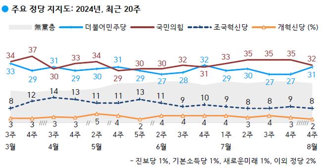 2024년 8월 넷째 주(20~22일) 현재 지지하는 정당은 국민의힘 32%, 더불어민주당 31%, 조국혁신당 8%, 개혁신당 2%, 진보당, 기본소득당, 새로운미래 각각 1%, 이외 정당/단체 2%, 지지하는 정당 없는 무당(無黨)층 22%다.
