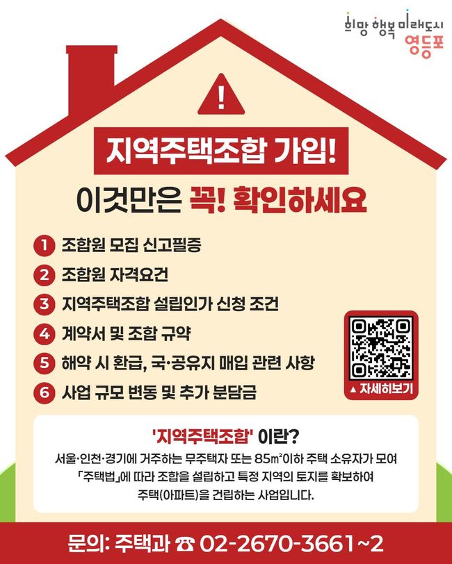 아울러 구는 지역주택조합 피해 예방을 위한 홍보도 강화하고 있다. 조합 가입 안내 리플릿을 동주민센터에 비치하고 카드뉴스를 누리 소통망(SNS)에 게시해 주민에게 경각심을 높인다. 영등포구 홈페이지에서 ‘지역주택조합’을 검색하면 사업 현황, 절차, 피해 사례 등도 확인할 수 있다.
