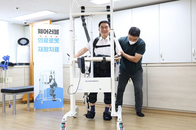문헌일 구로구청장이 착용형 보행보조 재활로봇을 체험하고 있다.