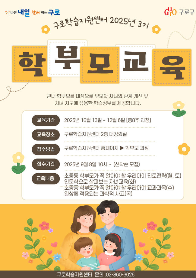 구로구(구청장 장인홍)가 오는 10월 13일부터 12월 6일까지 8주간 구로학습지원센터 2층 대강의실에서 ‘2025년 3기 학부모 프로그램’을 운영한다고 밝혔다