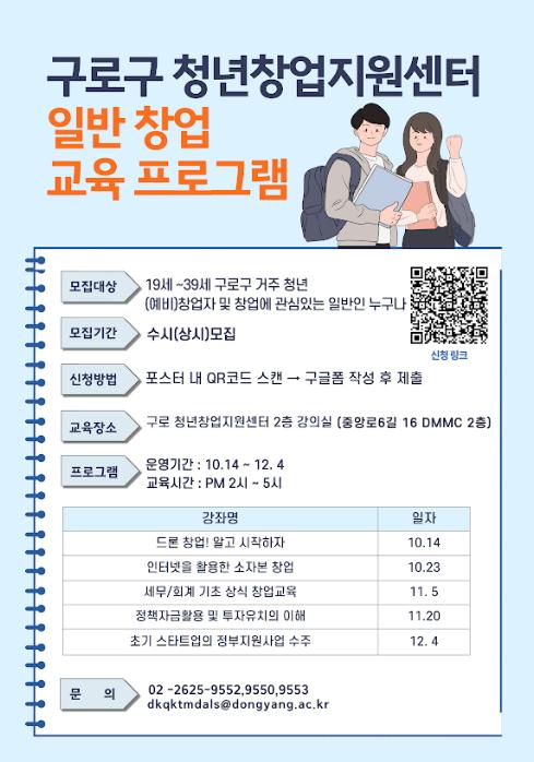 일반 창업교육은 10월 14일부터 12월 4일까지 총 5회로 진행된다. 강의 주제는 드론 창업, 소자본 창업, 세무 회계 기초, 정책자금 활용, 정부지원사업 수주 전략 등으로 실생활과 밀접한 분야로 구성됐다. 교육은 매회 오후 2시부터 5시까지 구로 청년창업지원센터 2층 강의실(중앙로6길 16 DMMC 2층)에서 열린다.
