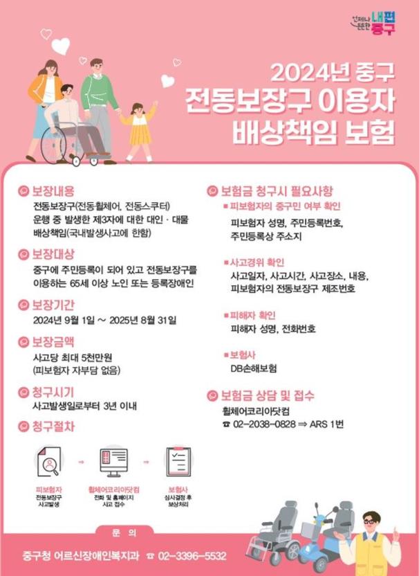서울 중구는 9월부터 관내 등록장애인과 65세 이상 어르신 중 전동보장구를 이용하는 경우 ‘이용자 배상책임보험’을 지원한다.