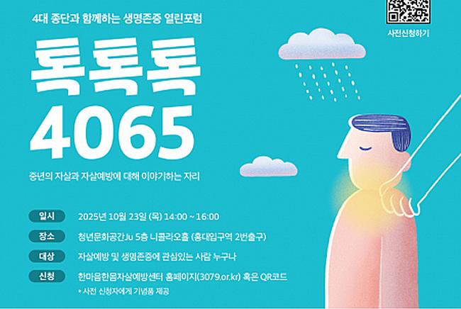 서울시자살예방센터가 10월 23일(목) 14시 청년문화공간JU 니콜라오 홀에서 2025년 살사프로젝트 열린포럼 ‘톡톡톡 4065’를 개최한다.