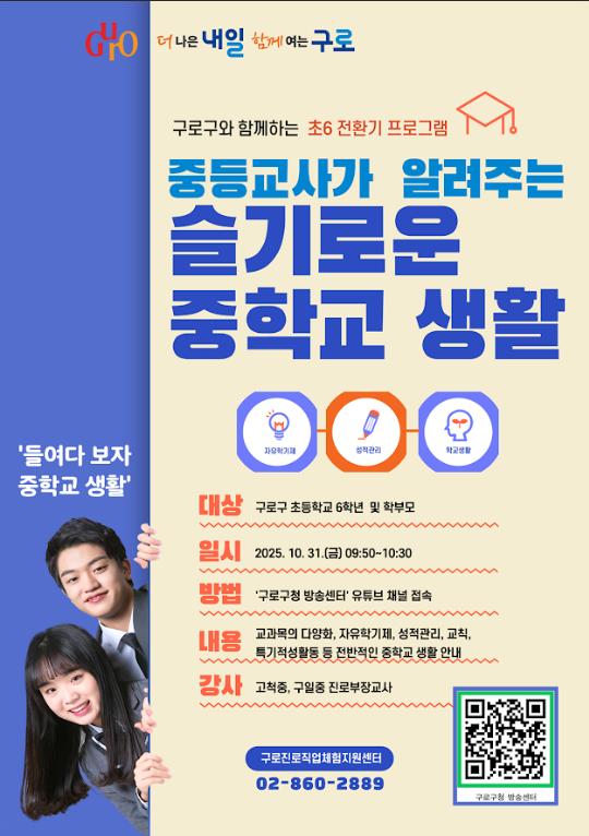 구로구 슬기로운 중학교 생활 홍보 포스터이번 프로그램은 중학교 입학을 앞둔 학생과 학부모가 겪는 불안과 궁금증을 해소하고 입학 전 꼭 알아야 할 정보를 미리 습득할 수 있도록 마련됐다.