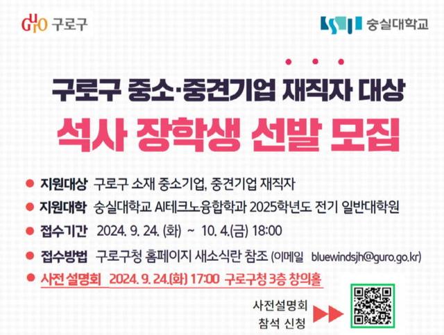 구로구가 숭실대 AI테크노융합학과 석․박사 과정 장학생을 8명 모집한다.