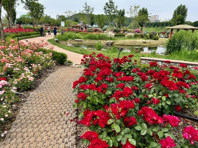 장미꽃이 활짝 핀 구로구 안양천 생태초화원 모습