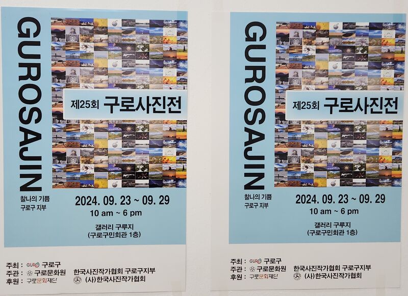 ‘구로문화원(문화원장 이계명)‘과 ’(사)한국사진작가협회구로구지부(지부장 이근숙)‘ 주관 제25회 구로사진전이 “찰나의 기쁨”이라는 주제로 9월 24일 개막전을 시작으로 29일까지 6일 간 구로구 구민회관 1층 갤러리 구루지에서 열리고 있다.