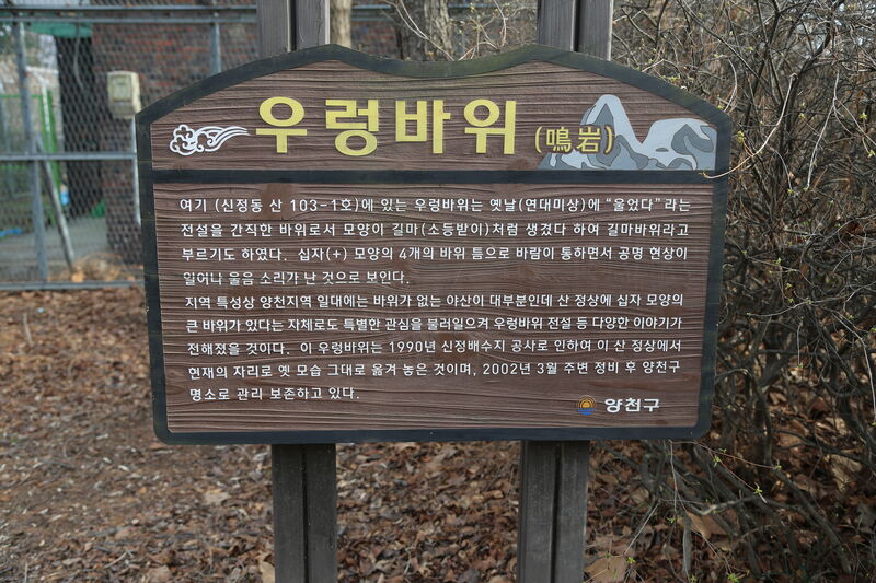 우렁바위 이야기는 한글학회에서 1966년 발행한 ‘한국지명총람’ 오류출장소 고척동 편에 나온다. 우렁바위가 있는 곳을 우렁바위산이라고 했다는 내용도 들어 있다. 고척2동 덕의리 마을에 있는 ‘여계묘역’ 뒷산이다. 원래는 구로구에 속한 우렁바위산의 정상부에 있던 것을 1990년 신정배수지 공사 때 지금의 자리로 옮겨 놓은 것이다. 지금은 양천구에서 명소로 관리하고 있다.