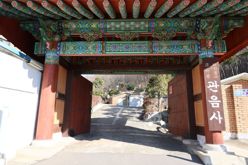 관음사 연혁기에 ‘관음사는 궁동 149-3 청룡산 중턱에 자리한 사찰로 비구니 보련 스님의 원력으로 정사를 건립하여 불당을 모시고 관음사라 명명하였다’라고 기록되어 있다.