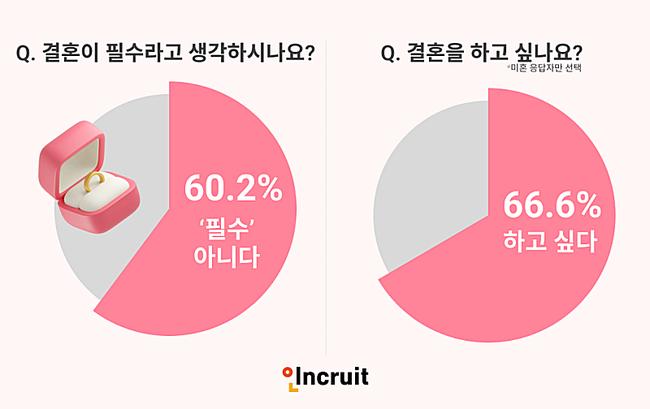 직장인 10명 중 6명은 결혼을 인생의 필수 요소로 여기지 않는 것으로 나타났다. HR테크 기업 인크루트가 직장인 653명을 대상으로 실시한 설문조사 결과, 60.2%가 결혼을 필수가 아니라고 응답했다고 밝혔다.