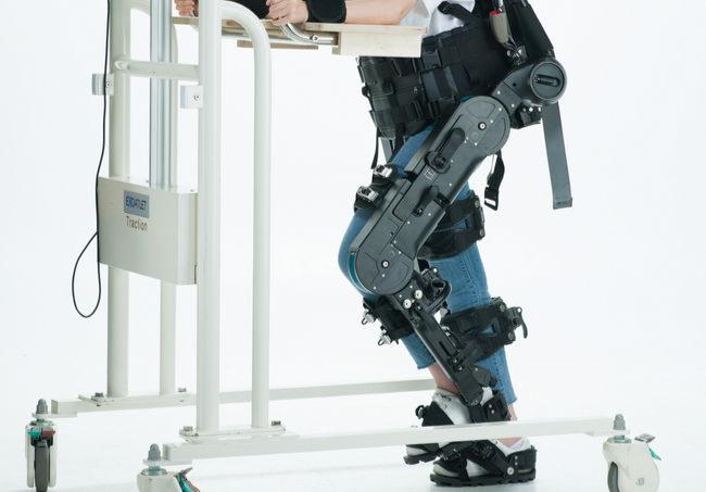 모델이 웨어러블 재활로봇을 착용하고 재활하는 모습을 시연하고 있다.