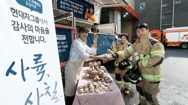 현대차그룹은 이벤트 목표 달성 이후인 지난 24일(수)부터 26일(금)까지 캠페인 영상 제작에 참여한 인천과 강원, 제주소방본부에 간식차 이벤트를 실시해 무더위와 수해 복구 작업에 구슬땀을 흘리는 약 500여 명의 소방관들을 위해 음료와 과일, 샌드위치 등의 간식을 제공했다.