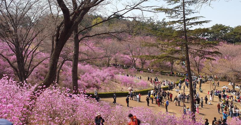 상춘객들로 북적이는  7호선 부천종합운동장역 2번 출구를 지나 동산 입구에 들어서면 두 눈이 번쩍 뜨일 정도로 연한 핑크빛 진달래꽃이 온산을 뒤덮여 있다. 진달래꽃 사이사이로 알록달록한 차림새를 한 사람들의 행렬이 끝없이 이어진다. 이곳저곳에서 진달래꽃을 배경 으로 인증샷을 남기느라 여념이 없다.