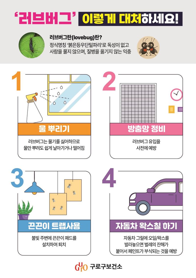 구는 러브버그 발생 시 대처 방법 등을 알리기 위해 16개 동에 현수막을 설치하고 공동주택 입주자대표 교육 시 포스터를 배부하는 등 홍보를 확대한다. 구청 누리집, 사회관계망서비스(SNS) 등 다양한 매체를 통해 주민 인식 제고와 자율 방역 참여도 유도하고 있다.