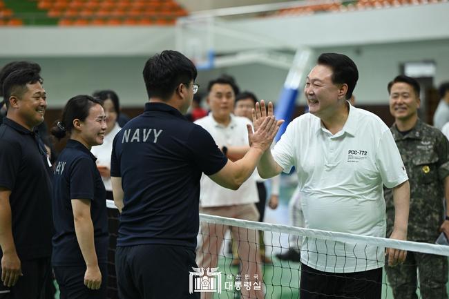 윤 대통령은 7일 오후 해군 및 해병대 장병들과 농구, 족구 등 다양한 체육 활동을 하며 단합을 다졌다. 윤 대통령은 체육활동을 마치고 이동하면서 모든 참여 장병들에게 "열심히 해요. 해군 화이팅!"이라는 응원과 함께 "다치지 말라"는 당부를 덧붙였다.