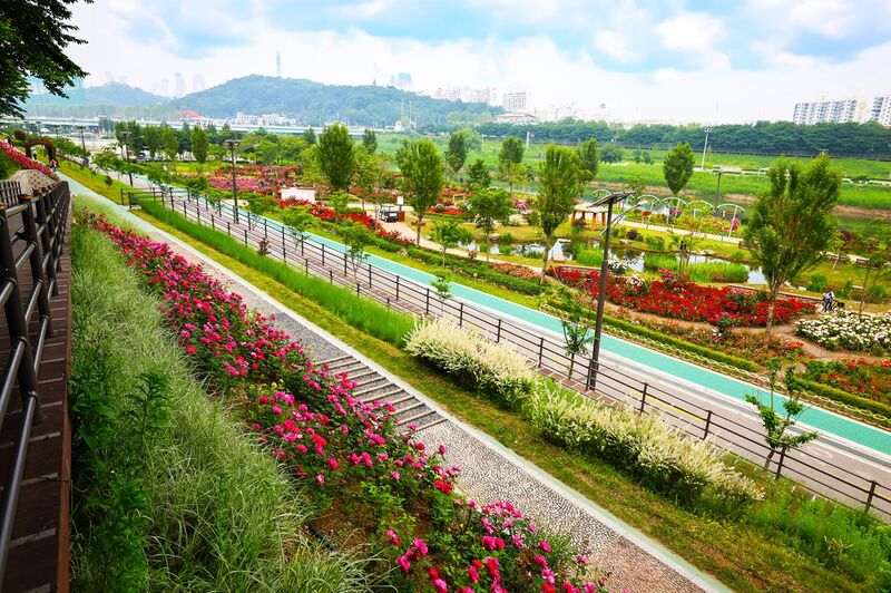 이 외에도 ▲뱀쇠다리 주변 초화원 장미원(1,200㎡)에는 '안젤라' 등 8종이 ▲신정교~광명대교 구간 제방 사면(4,000㎡)에는 '둡트로쉬' 등 12종의 사면 장미가 아름다운 경관을 연출하고 있다.