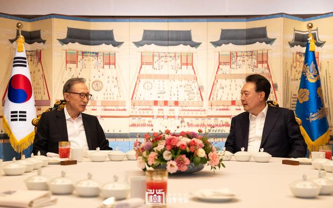 만찬에는 윤 대통령 부부, 이 前 대통령 부부, 정진석 비서실장 부부가 함께 했다. 이번 만찬은 윤 대통령과 이 前 대통령의 첫 공식 만남이다.