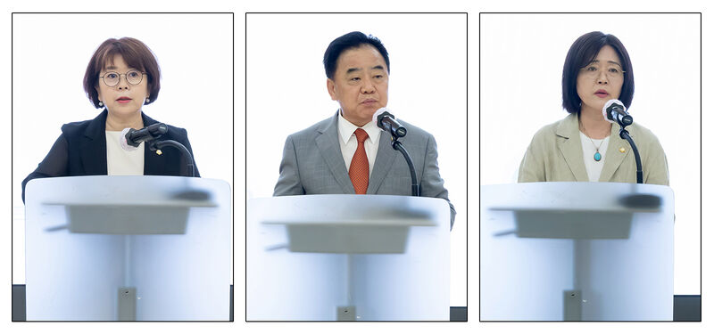▶2025년도 행정사무감사 총평(왼쪽부터 방은경 행정기획위원장, 정대근 의장, 최태영 복지건설위원장)