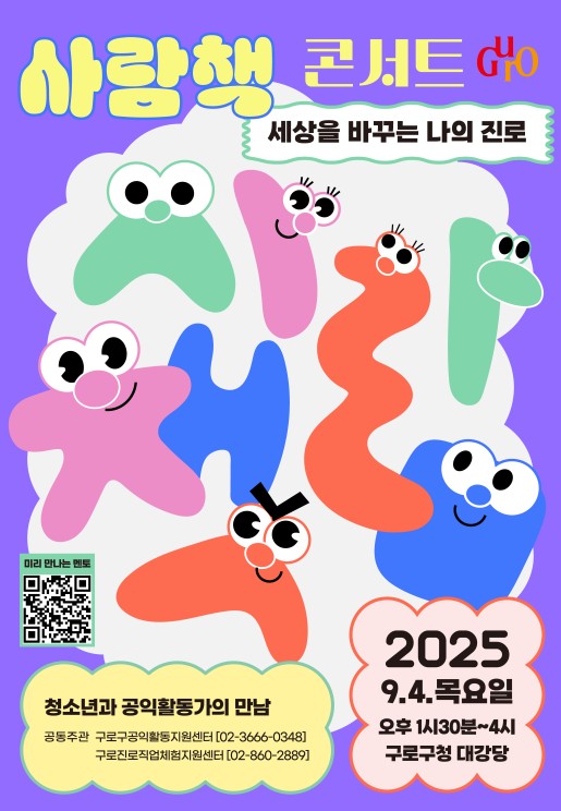 구로구(구청장 장인홍)가 ‘세상을 바꾸는 나의 진로’를 주제로 ‘사람책 콘서트’를 9월 4일 구로구청 강당에서 연다고 19일 밝혔다. 구로진로직업체험지원센터와 구로구 공익활동지원센터가 협업을 통해 준비했다. 청소년들에게 다양한 삶의 경험을 전하고 중학생들이 공익활동가와 함께 진로와 사회적 역할을 고민하는 시간을 갖게 하는 자리이다.