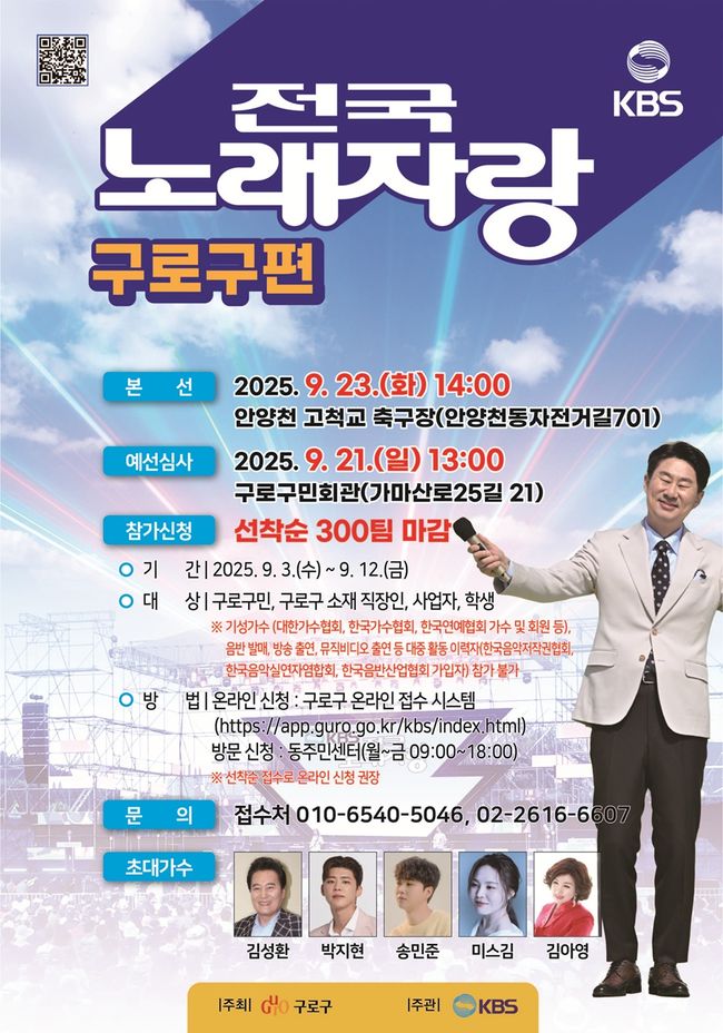 구로구(구청장 장인홍)가 KBS 장수 프로그램 ‘전국노래자랑’ 구로구편 예심과 본선을 진행한다. ‘전국노래자랑’은 세대를 아우르며 국민적 사랑을 받아온 대표적인 참여형 음악 프로그램이다.