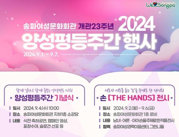 송파구는 9월 1일부터 7일까지 이어지는 ‘양성평등주간’을 맞아 9월 4일 10시 송파여성문화회관 소강당에서 기념식을 개최한다고 밝혔다.