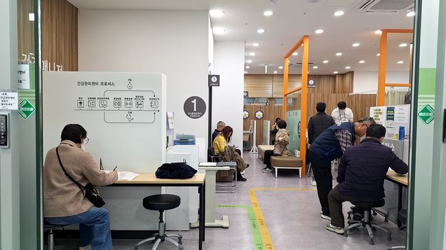구로구보건소 건강관리센터를 방문한 주민들이 대사증후군 검진과 건강상담을 위해 설문지를 작성하고 있다.